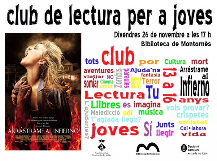 Es tracta d’un club de lectura que es farà un cop al mes i que coordinarà la Mon Mas, que actualment ja col·labora amb la Biblioteca amb L’hora del conte. La primera sessió servirà per intercanviar idees sobre com es pot estructurar aquest no espai i inclourà la projecció de la pel·lícula Arrástrame al infierno.