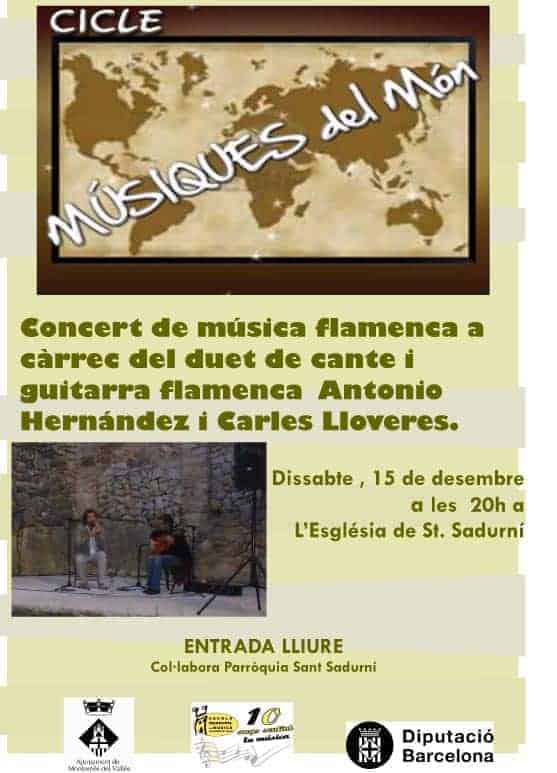 Un concert de música flamenca a càrrec del duet de cante i guitarra Antonio Hernández i Carles Lloveres es la proposta d'aquest dissabte dins el cicle "Músiques del món" organitzat per l'Escola Municipal de Música, Dansa i Aula de Teatre.