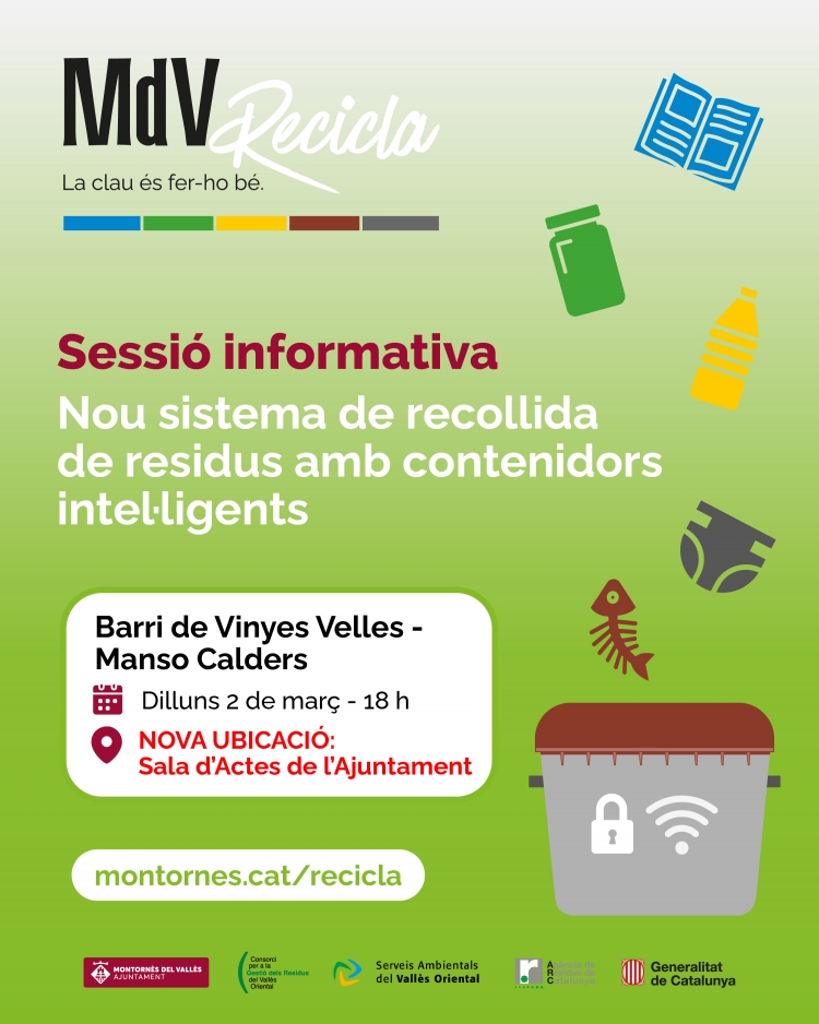 El veïnat del barri de Vinyes Velles - Manso Calders està convocat a la sessió informativa sobre el nou sistema de recollida de residus amb contenidors intel·ligents.