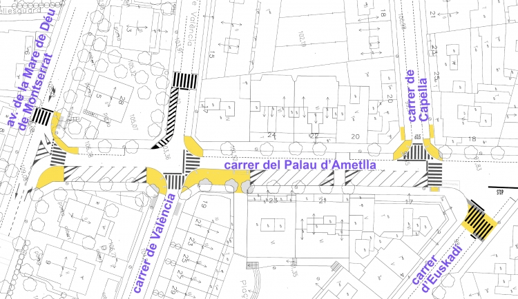 Els Serveis Tècnics Municipals han projectat adaptacions específiques per a cadascuna de les cruïlles del tram del carrer de Palau d'Ametlla, entre Mare de Déu de Montserrat i Euskadi. En general, es construiran orelles i s'ampliaran les voreres, per donar més espai i seguretat als vianants i es crearan els guals per facilitar l'accés de persones amb mobilitat reduïda. A la vorera dreta del tram entre Mare de Déu del Carme i València, es canviarà l'aparcament en línia per places en semibateria, igual que ja hi ha a la resta del carrer. A la mateixa banda del carrer, després de la cruïlla amb València, l'ampliació de voreres inclourà l'àrea de contenidors de residus i la reordenació dels passos de vianants.